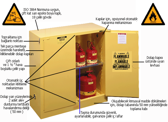 Oluşabilecek kimyasal madde dökülmeleri için, dolap tabanında 50 mm yüksekliğinde toplama kabı